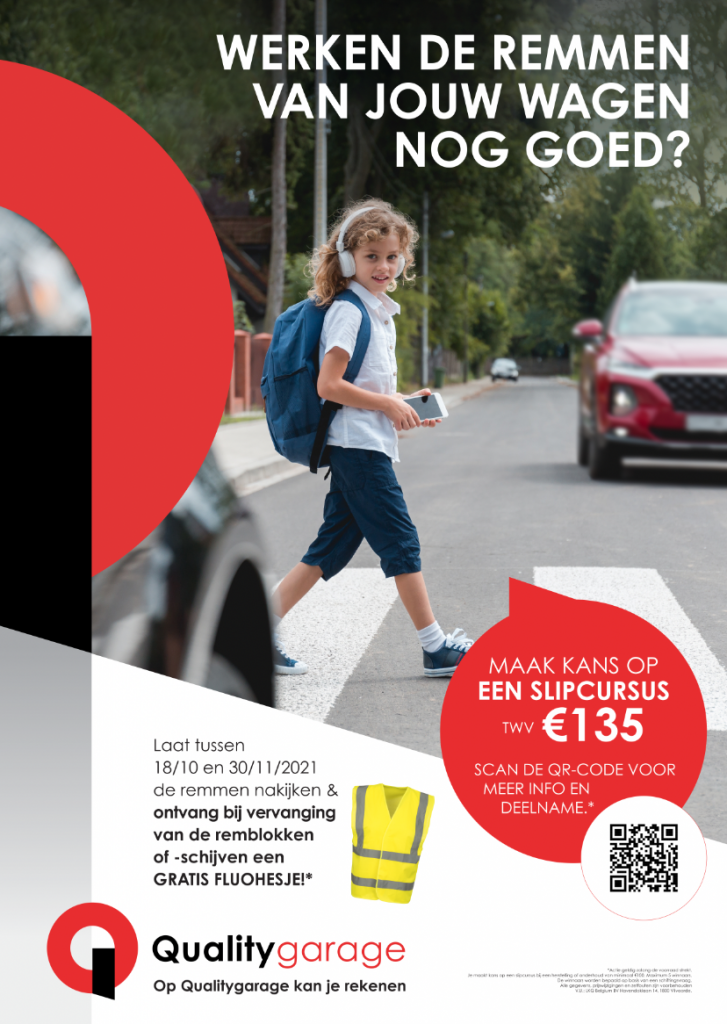 Het winterseizoen komt er aan, dus goed werkende remmen zijn zeker geen overbodige luxe. Daarom ontvangt u bij vervanging van remblokken of -schijven een gratis fluohesje, zodat u ook zonder de wagen gezien wordt in het verkeer. Daarnaast maakt u ook kans op een slipcursus t.w.v. € 135 door deel te nemen aan onze wedstrijd via de barcode op de affiche. Ga dus kom eens langs bij ons!